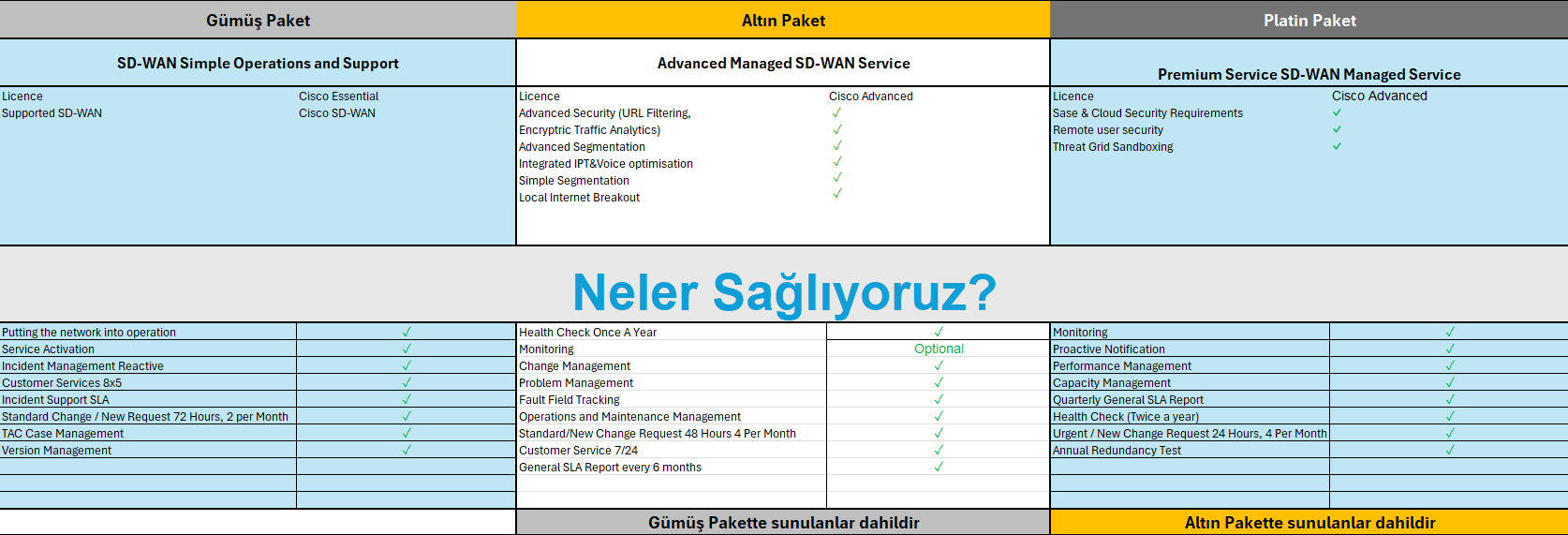 Aşağıda mevcut 3 paket Yönetilen Hizmet seçeneği mevcut. Ama bu paketleri ihtiyaçlarınıza göre yeniden şekillendirip size özel hale getiriyoruz. Bunun için lütfen satış ekiplerimize ulaşın.