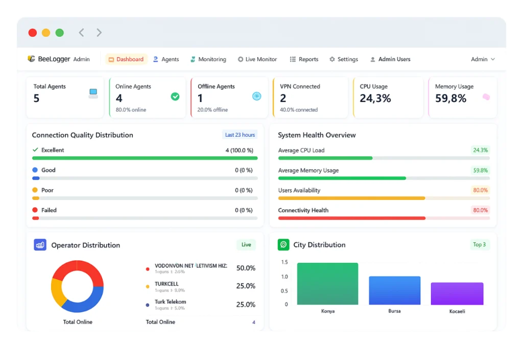 BeeLogger; kurumların uzaktan çalışan cihazlarını, VPN bağlantılarını, ağ performansını and kritik uygulamalarını gerçek zamanlı olarak izleyebilmesini sağlayan bütünleşik bir IT görünürlük ve teşhis platformudur.